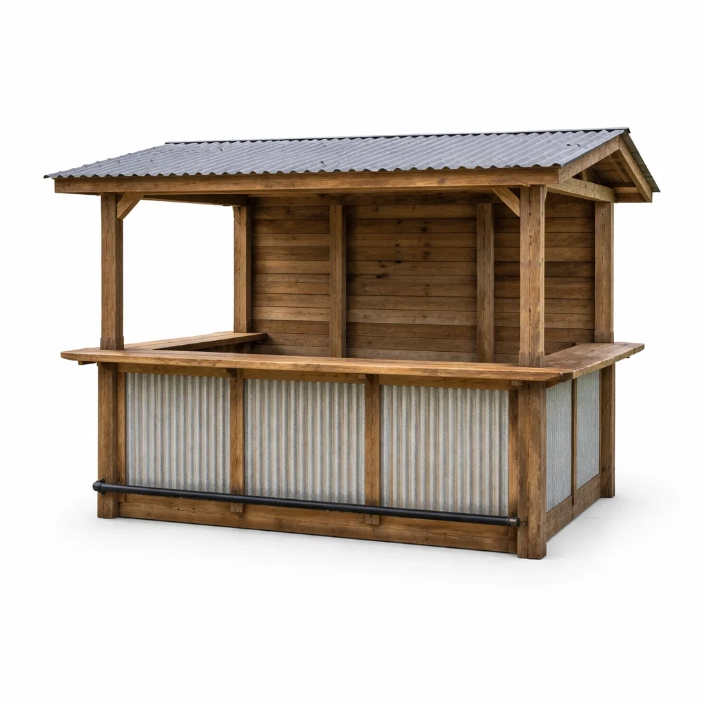 Struttura in legno massello con pannelli in metallo ondulato galvanizzato.